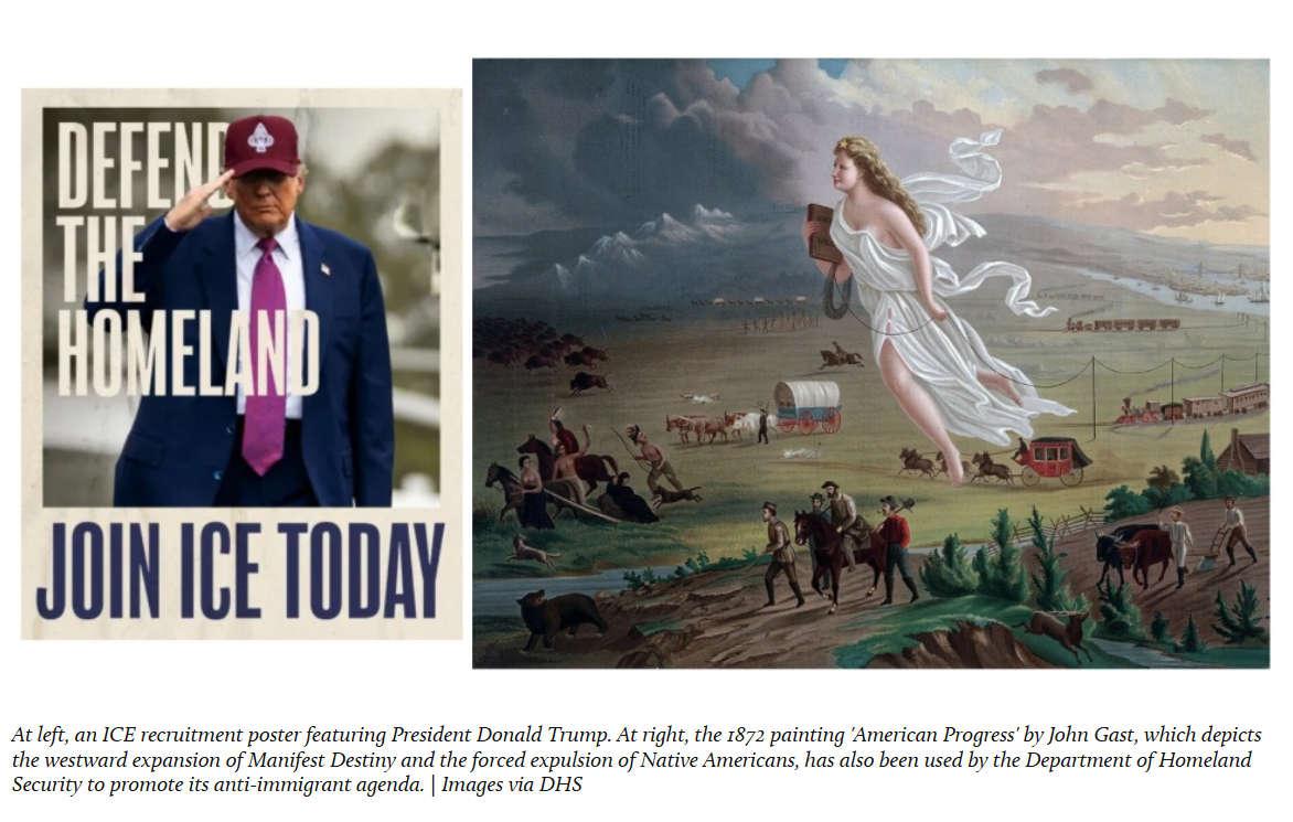 As these actions have been met with lawsuits, and growing public disgust, it became clear that ICE did not have the resources to deport the vast numbers that Trump had promised. But on July 4th the Republicans passed a reactionary budget bill, the so-called Big Beautiful Bill, which increases funding for ICE by an enormous $76 billion. ICE is now set to have a bigger budget than the armed forces of many countries in the world – a centrally directed national police force on a scale that the US hasn’t seen before. Its umbrella agency, Homeland Security, is already huge, with 80,000 employees, but ICE’s new budget is bigger than all other Federal domestic law enforcement agencies put together. It is recruiting its new agents from existing police forces and the military, offering generous salaries and a $50,000 retention bonus. The bonus alone is more than most Americans make in a year. Its recruiters are clearly aiming to recruit people who buy the racist idea that American culture is under attack, using slogans like “A Heritage to be proud of, a Homeland worth Defending” and “Remember your Homeland’s Heritage”, attached to nineteenth century paintings of white people setting the American West.