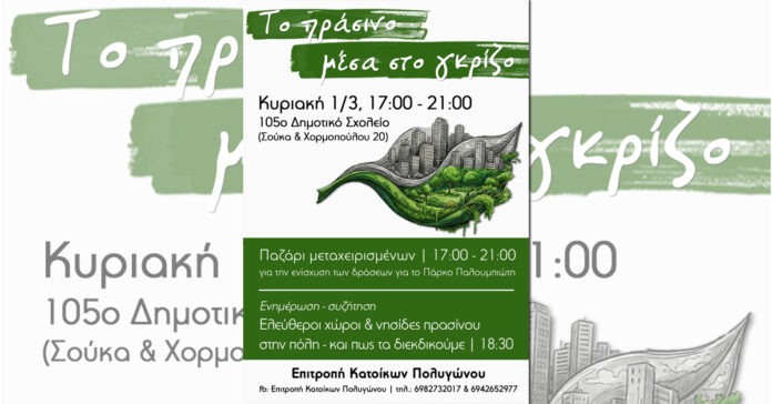 Την Κυριακή 1 Μάρτη, από τις 17:00 έως τις 21:00, η Επιτροπή Κατοίκων Πολυγώνου διοργανώνει εκδήλωση στο 105ο Δημοτικό Σχολείο Αθηνών (Σούκα & Χρομοπούλου 20), με τίτλο «Το πράσινο μέσα στο γκρίζο».