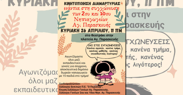 Από τις 19 Νοέμβρη, συνολικά η εκπαιδευτική κοινότητα της Αγίας Παρασκευής βρίσκεται σε αναστάτωση, μετά από την αιφνιδιαστική απόφαση της Διεύθυνσης Πρωτοβάθμιας Εκπαίδευσης Β ́Αθήνας, υπό την οδηγία συγχωνεύσεων, φυσικά, του Υπουργείου Παιδείας, να προωθήσει τη συγχώνευση των δύο Νηπιαγωγείων της πόλης μας, του 2ου και του 10ου Νηπιαγωγείου. Αμέσως, σε συνάντηση που ζήτησε η Ένωση από τον Αντιδήμαρχο Παιδείας, οι Σύλλογοι Γονέων, οι Σύλλογοι Διδασκόντων, η Ένωση Γονέων Αγίας Παρασκευής και ο Σύλλογος Εκπαιδευτικών Π.Ε. “Περικλής” ξεκαθάρισαν ότι μια τέτοια εξέλιξη θα είχε καταστροφικές επιπτώσεις στην ποιότητα της εκπαίδευσης των παιδιών μας. Μάλιστα, μετά την παρέμβαση εκπροσώπων σύσσωμης της σχολικής κοινότητας στο Δημοτικό Συμβούλιο της Τετάρτης 26/11 αποφασίστηκε ομόφωνα η αρνητική γνωμοδότηση του Δήμου σχετικά με την συγκεκριμένη συγχώνευση.