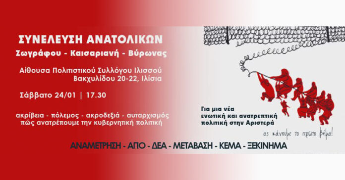 Η ιδρυτική συνέλευση των Ανατολικών συνοικιών (Ζωγράφου, Καισαριανή, Βύρωνας) θα γίνει το Σάββατο 24/1 στις 5.30 μ.μ., στην Αίθουσα του Πολιτιστικού Συλλόγου Ιλισσού, Βακχυλίδου 20-22, Ιλίσια.
