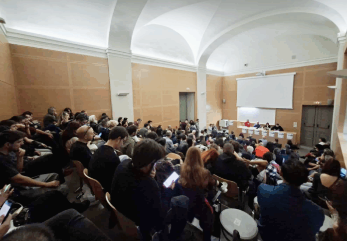Σε ένα κατάμεστο αμφιθέατρο, με πολύ κόσμο να μην χωράει στις θέσεις και να κάθεται στις σκάλες, η εκδήλωση κράτησε ζωντανό το ενδιαφέρον για περίπου δύο ώρες. Τη συζήτηση άνοιξε η Χρύσα Τσικαλουδάκη εκ μέρους της πρωτοβουλίας και ο Δημήτρης Καλτσώνης, καθηγητής θεωρίας κράτους και δικαίου. Περιέγραψαν τη διαδικασία διαρκούς συρρίκνωσης των δημοκρατικών δικαιωμάτων και ελευθεριών σε μια περίοδο σοβαρής οικονομικής και πολιτικής κρίσης στην Ελλάδα και τον κόσμο.