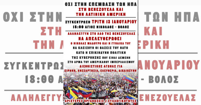 Αριστερές οργανώσεις και συλλογικότητες του Βόλου καλούν σε συγκέντρωση αλληλεγγύης προς το λαό της Βενεζουέλας, την Τρίτη 18/1, στις 6:30μμ στον Άγιο Νικόλαο. Το Ξεκίνημα στηρίζει τη συγκέντρωση. Ακολουθεί η ανακοίνωση του «Ξ»: